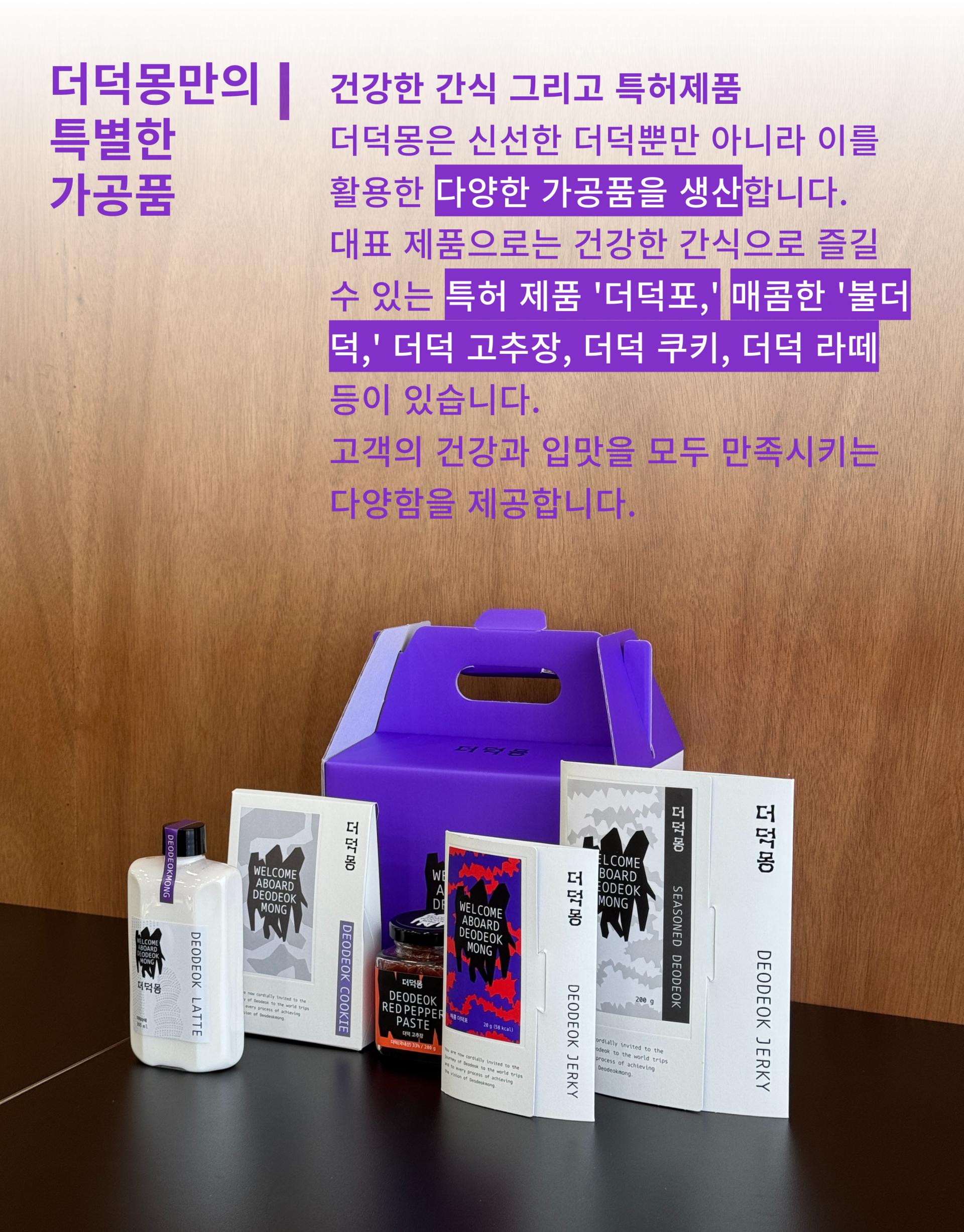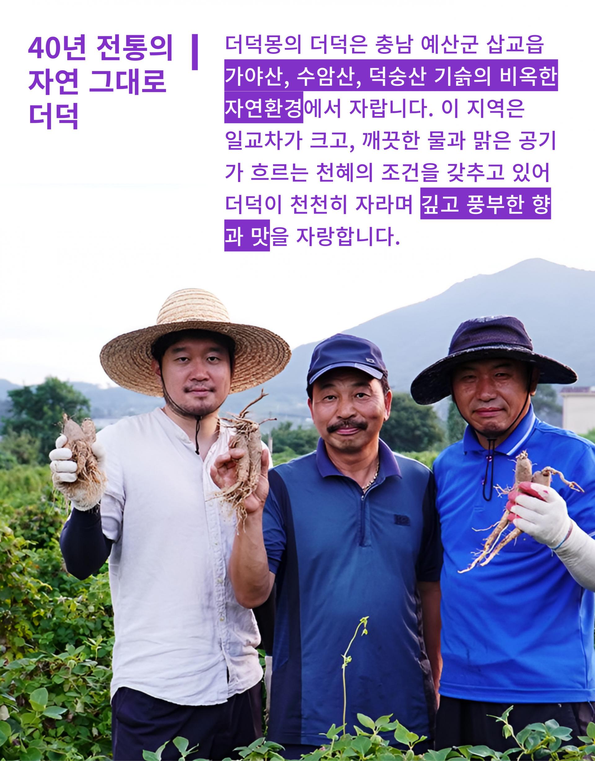 네, 더덕몽은 3대를 이어온 더덕 농장에서 직접 기른 더덕으로 제품을 개발하고 있습니다. 더덕에 대한 애정과 특용작물에 대한 이해도를 바탕으로 다양한 상품을 개발하여 출시해오고 있사오니 앞으로도 관심을 가지고 지켜봐 주세요!